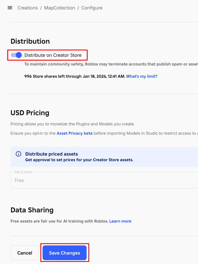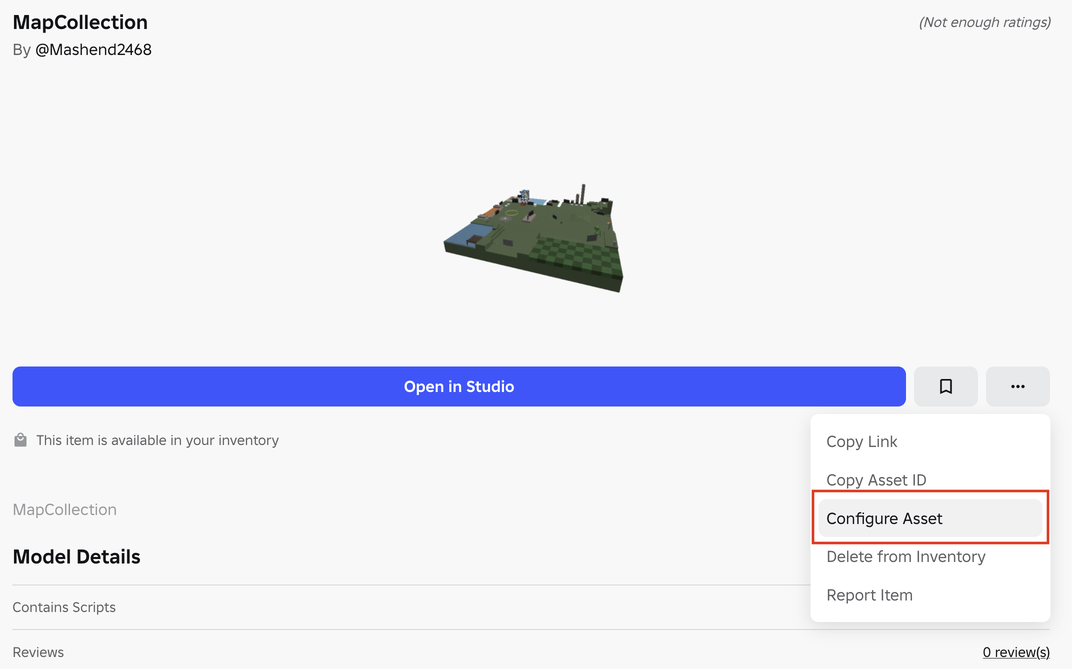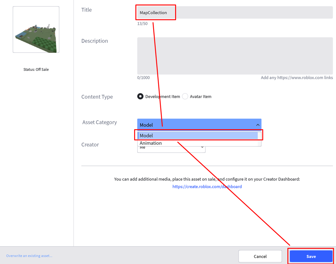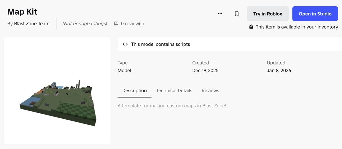 To import your map into Blast Zone, you'll need to make your model a free asset that anybody can use. This means other players will be able to open it in Studio and edit it, but more importantly, it means that Blast Zone will be able to import it. Skipping this step will prevent Blast Zone from being able to import your map.