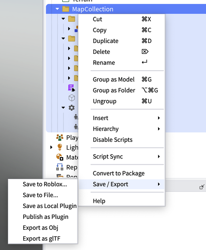 To do this, right click on MapCollection, then on the dropdown buttons "Save/Export" > "Save to Roblox".