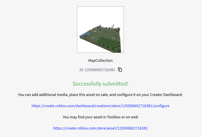 After a few moments, your new map will be uploaded to Roblox. It will give you two links and a long number, the model's id. Copy this id, we will use it to import the map into Blast Zone.