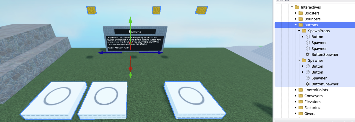 Spawns a prop on any parts named "Spawner" in the same model as the ButtonSpawner. Responds to all buttons in the same model, putting them on cooldown for 5 seconds or whatever the "Cooldown" attribute on the button is.